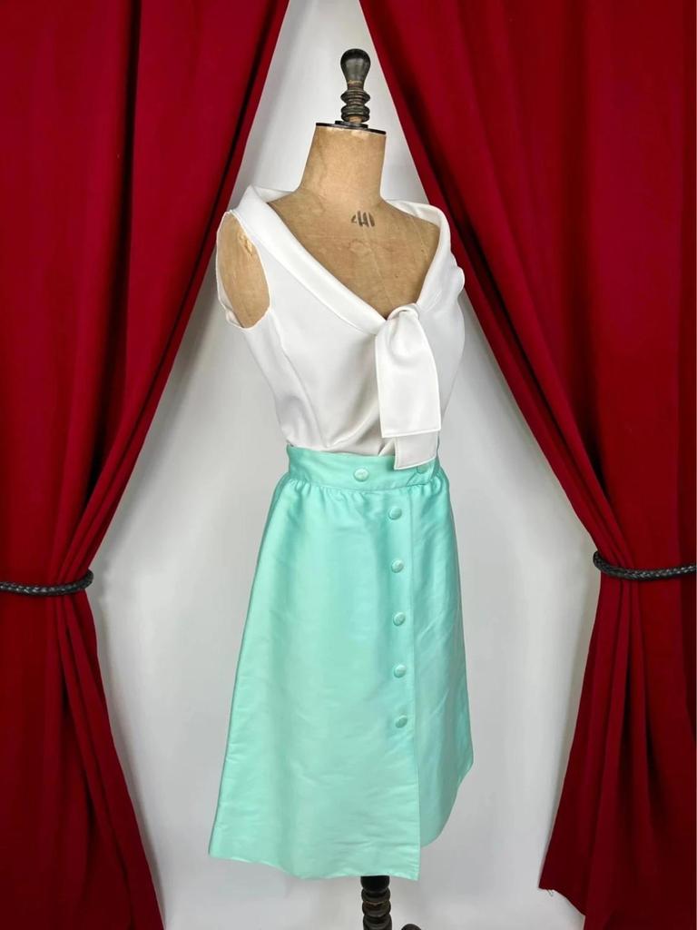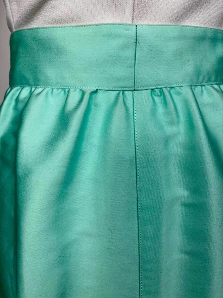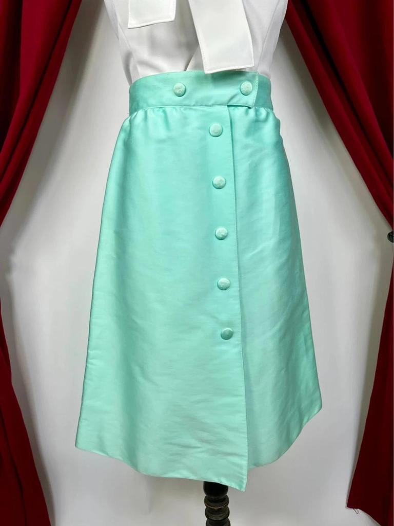 This vintage Courrèges skirt from the 1970s features a mint green satin cotton fabric with a subtle sheen. Designed with a high waist and an A-line silhouette, it offers a flattering fit. The front showcases the brand's signature button closure, adding a distinctive touch to the minimalist and futuristic style typical of Courrèges. The skirt is made in France and reflects the elegant and timeless aesthetic of the era, combining both style and quality craftsmanship suitable for collectors and vintage fashion enthusiasts alike.