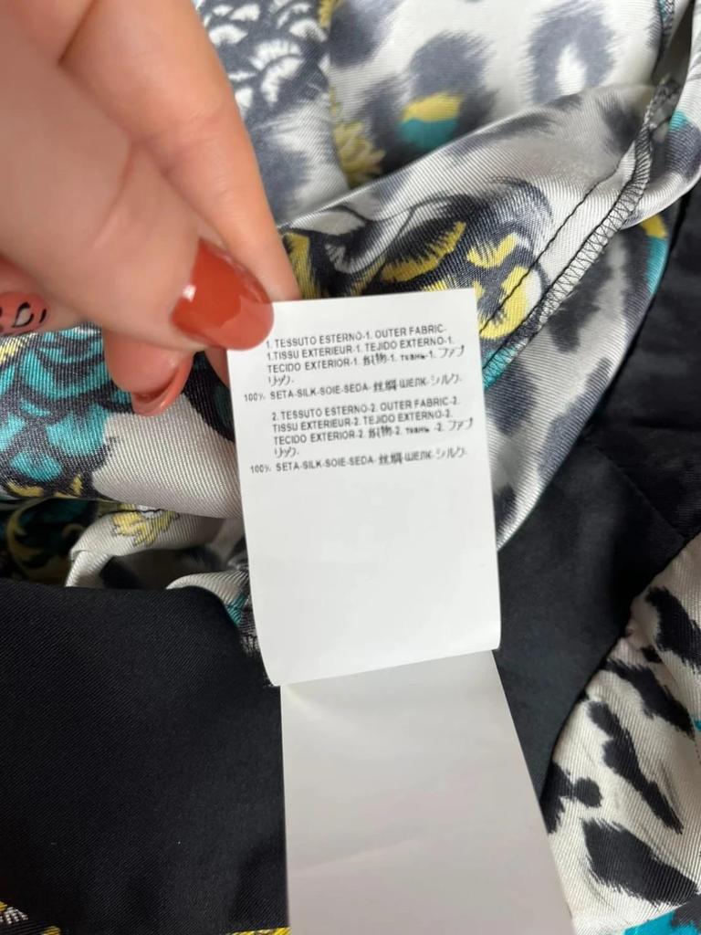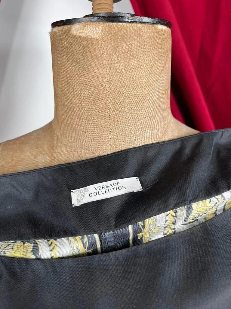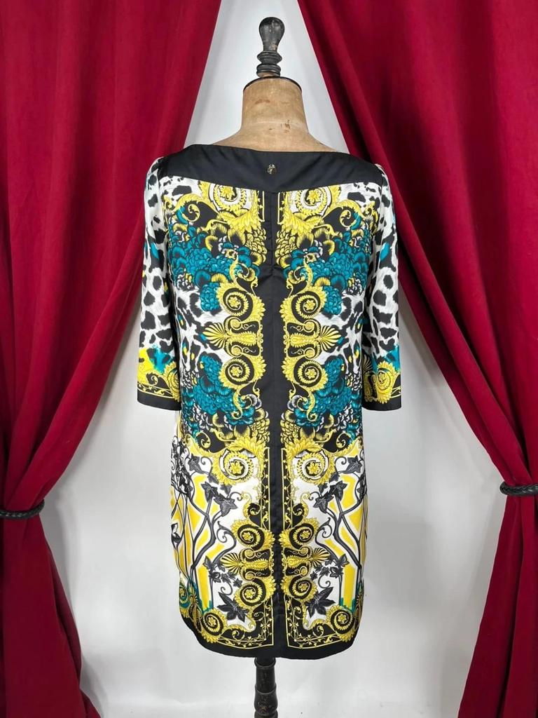 PRODUCT DETAILS Brand: Versace Collection Item: Dress Material: 100% Silk Color: Black, Gold, Turquoise Size: FR 36 / IT 40 / US 4 / UK 8 Condition: Very good Made in: Italy Notable details: Baroque leopard print, wide black collar, three-quarter sleeves, fluid silk fabric