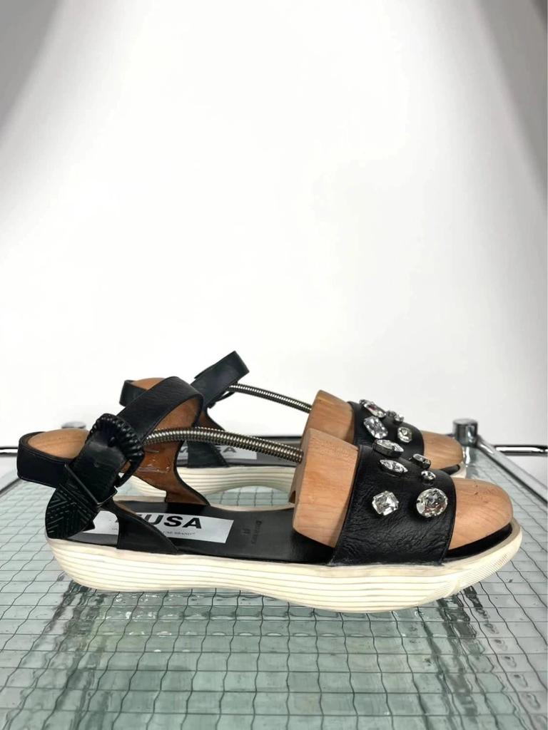 Product Details: - Brand: Golden Goose - Item: Sandals - Style / Fit: Flat, open-toe with ankle strap - Material: Leather - Color: Black - Size: EU 39 / FR 39 / US 8 / UK 6 - Condition: Very good condition - Made in: Italy - Notable details: Crystal embellishments on front strap, leather insole with MUSA logo
