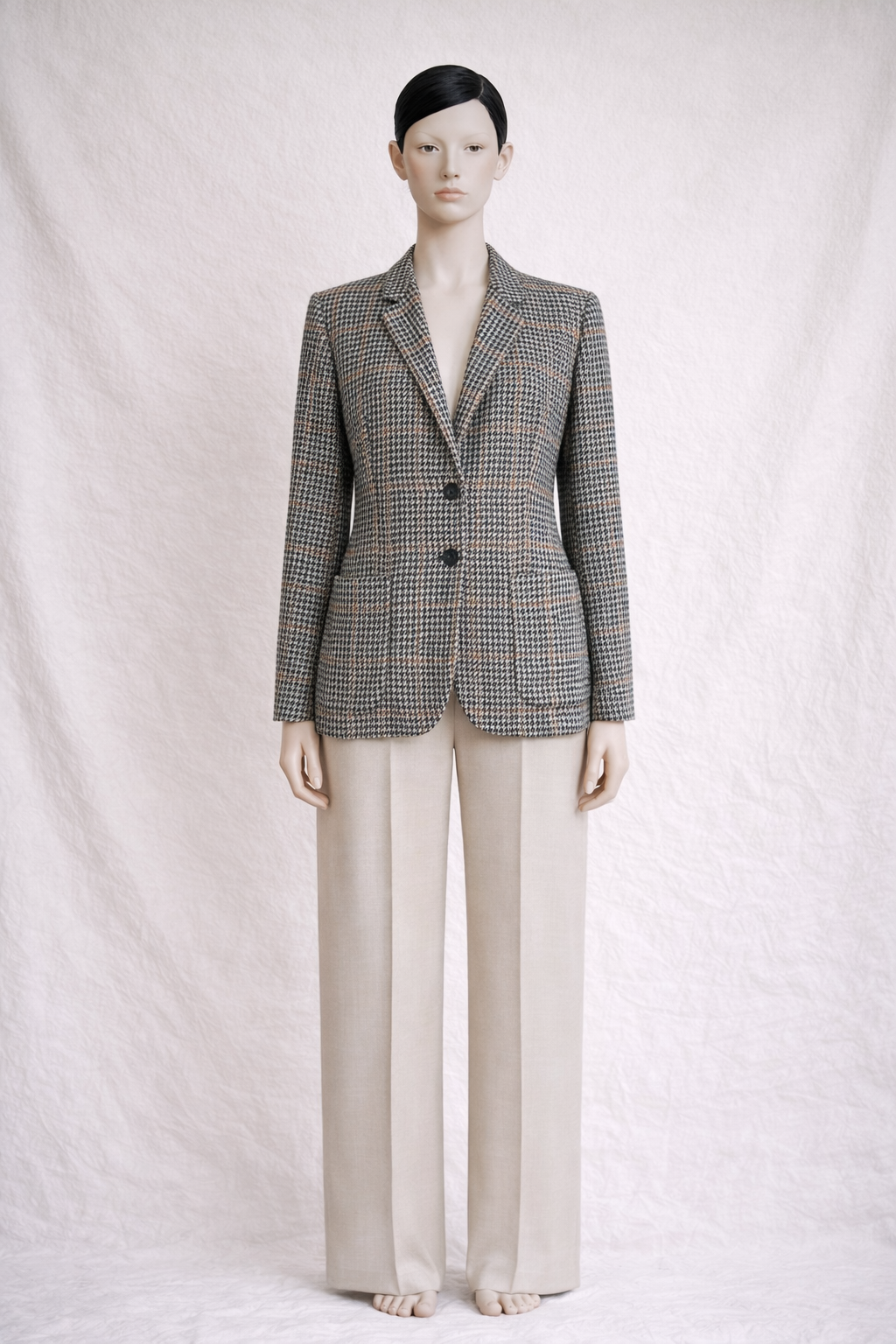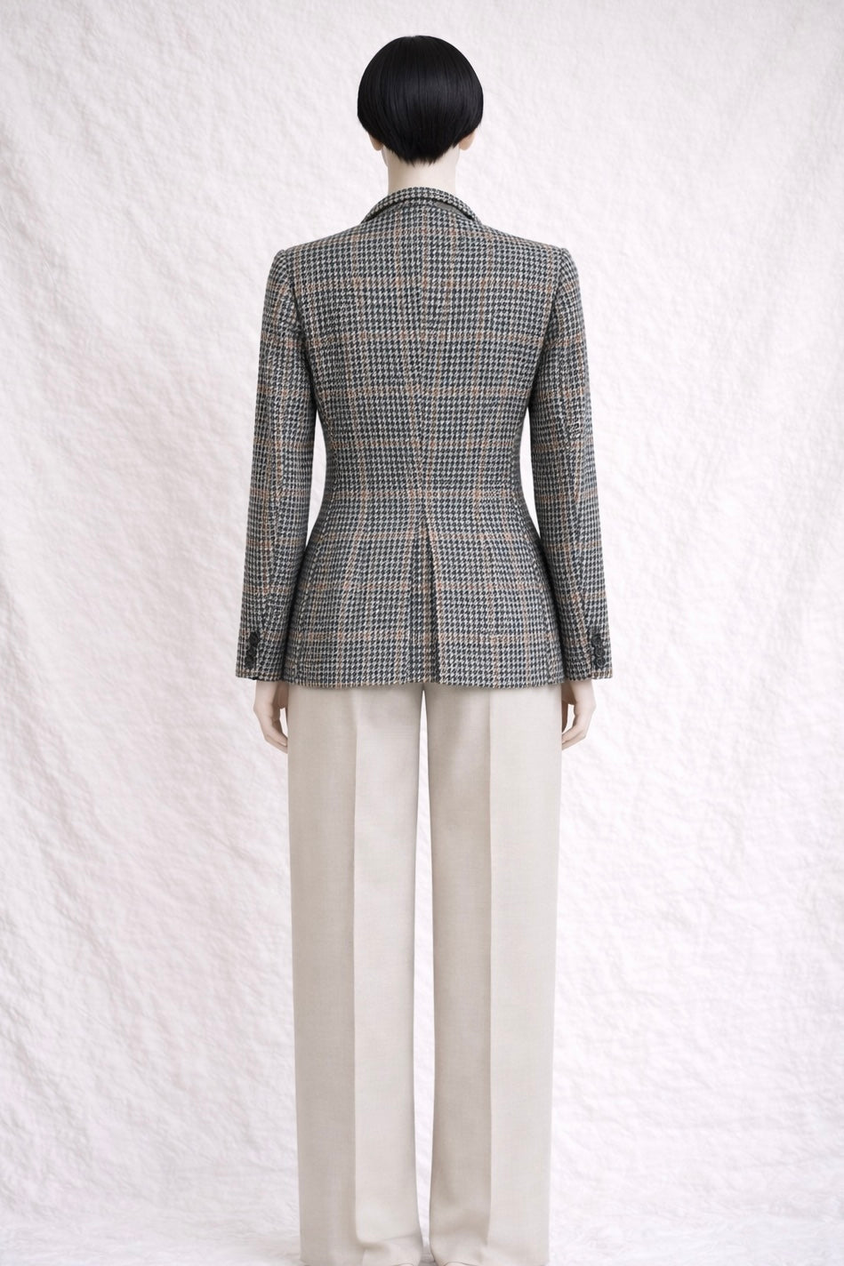 Blazer vintage authentique Burberrys, une pièce de tailoring britannique au charme intemporel, caractéristique de l’élégance classique de la maison. Confectionné en laine à motif pied-de-poule dans des tons de gris, écru et fines lignes camel, ce blazer présente une coupe cintrée et structurée, avec col tailleur, boutonnage simple et poches plaquées à l’avant.