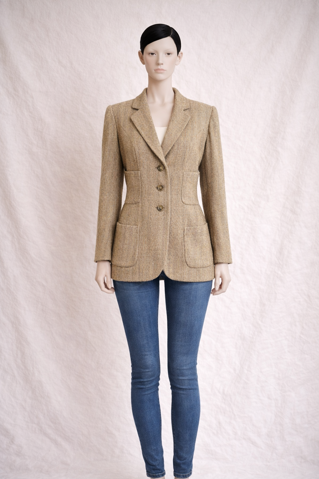 Blazer authentique Ungaro solo donna, une pièce élégante et structurée qui incarne parfaitement l’esthétique couture parisienne de la maison. Confectionné dans une laine épaisse au beige subtilement chiné, ce blazer séduit par sa coupe cintrée et allongée, pensée pour souligner la taille tout en conservant une allure naturellement sophistiquée. Le col tailleur classique, le boutonnage simple à trois boutons, ainsi que les poches plaquées renforcent son caractère tailoring, à la fois féminin et intemporel. Les épaules sont nettes sans excès de structure, offrant une silhouette harmonieuse et élégante, idéale aussi bien portée avec un jean qu’avec un pantalon habillé ou une jupe.